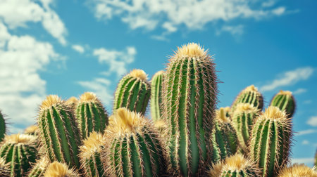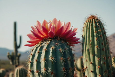 This striking image showcases blooming cactus flowers in vibrant colors, capturing the intricate details of nature's design in a stunning desert environment.