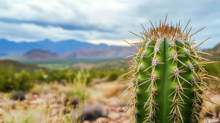 A close-up of a green cactus with sharp spines, set against a soft, desert landscape backdrop, capturing the beauty and resilience of desert flora.
