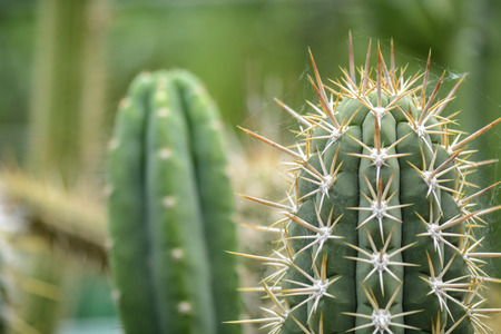 Close-up view of a lush green cactus with radiant thorns against a blurred background