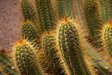 Prickly cactus with sharp spiked thorns along it in the desert.