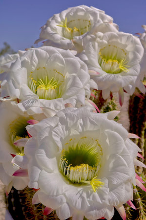 The large white blossoms of the night blooming Trichocereus Spachianus Cactus, also known as the Golden Torch and the Golden Column Cactus.
