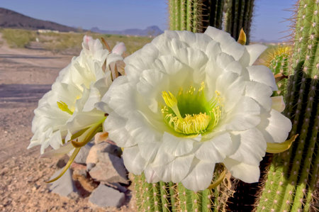 Large White Flowers Sajuaro Cactus Blooming Desert Botanical Garden Phoenix Arizona. Carnegiea gigantea. Largest cactus in World