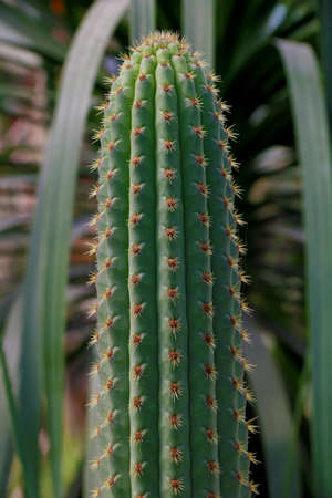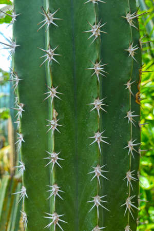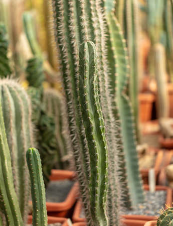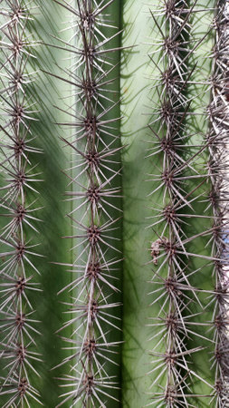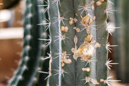 Part of green Cactus spikes in pot with long thorn, detail of large cactus plant showing needles and deep ribs, cactus spines. Macro close-up thor of cactus with macro and select focus