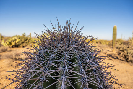 A closeup shot of a prickly cactus plant with large spines in Borrego Springs, CA under a clear sky