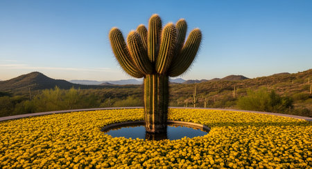 A large, majestic Saguaro cactus stands in the center of a circular pool of water, surrounded by a bed of bright yellow flowers. The unique desert garden is set against a backdrop of the Sonoran Desert mountains and a clear blue sky.
