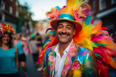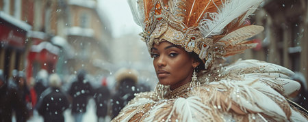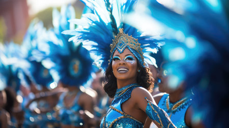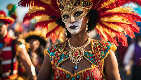 Latin performer in vibrant costume at festive street parade for Carnival. Concept Festival Celebrations, Street Parades, Latin Performers, Vibrant Costumes, Carnival Season