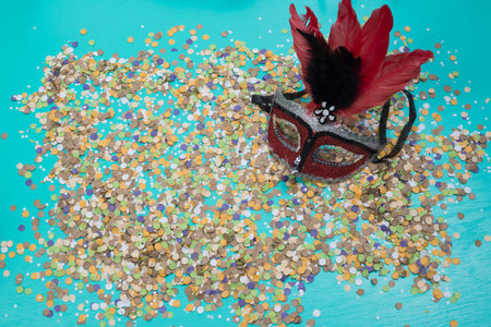 confetti spread on blue background with a female carnival mask.