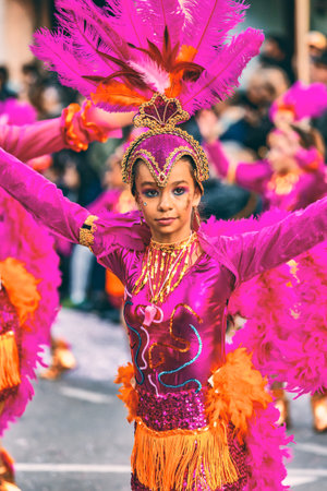LOULE, PORTUGAL - FEBRUARY 2020: Colorful Carnival (Carnaval) Parade festival participants on Loule city, Portugal.