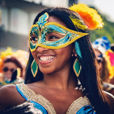 A masked woman with vibrant feathers and a dazzling costume smiles brightly during a carnival celebration. The festive atmosphere and the woman's joyful expression capture the spirit of this exciting event.