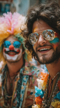 Close-up of two men enjoying a vibrant festival. One sports striking clown makeup and a colorful wig, while the other wears stylish sunglasses and festive attire.