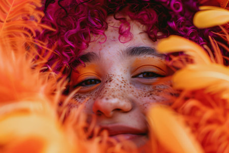 photo of a person with curly magenta hair, freckles dotted across their cheeks, and a playful glint in their eye, surrounded by vibrant orange feathers, HD, 35mm, trendy style, narrative-driven visuals --ar 3 2 --stylize 10 Job ID c70e31e6-7a04-4d60-bb45-3494b1ae50df