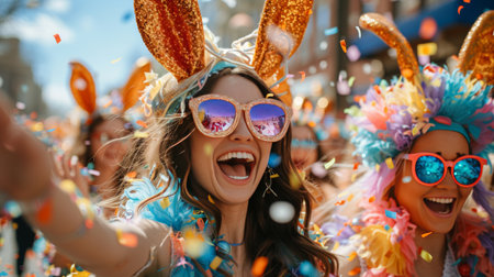 A group of vibrant, smiling women wearing colorful outfits and accessories enjoying a lively street parade scene filled with happiness and diversity.