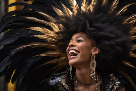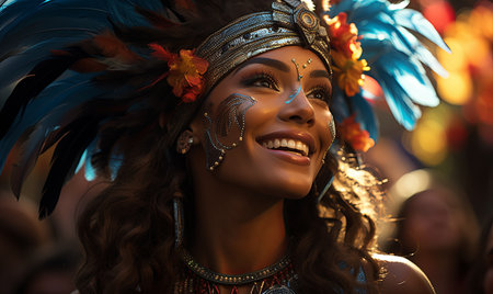 Generative AI Image of American Woman Samba Dancer with Headdress Smiling in City Street