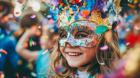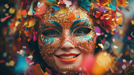 A joyful individual wearing a colorful mask surrounded by vibrant confetti, embodying the spirit of celebration and happiness in a lively carnival atmosphere.