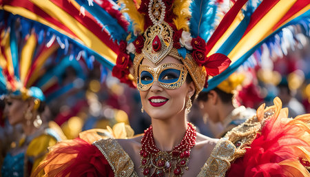 A woman in a vibrant carnival costume with feathers and a mask smiles brightly, capturing the festive spirit of the event.