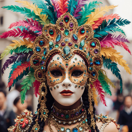 A woman wearing a mask and feather headdress during a carnival celebration. She is surrounded by a crowd of people, and the atmosphere is festive and joyful. The woman's costume is colorful and intricate, and her mask is a beautiful work of art.
