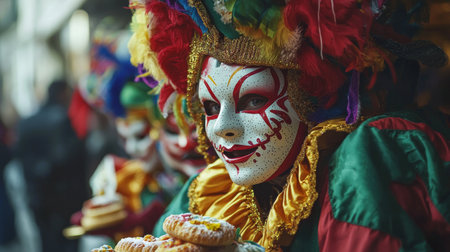 Colorful Venetian Carnival Celebration with Masked Performers Enjoying Pastries. Concept of Cultural Festivity, Traditional Costumes, Artistic Masks, and Lively Street Celebrations. Copy space.