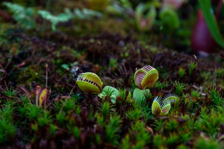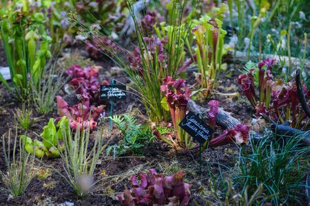 Botanical garden with carnivorous flowers. Jungle foliage stock photography. Venus fly traps and pitcher plants. Jungle foliage stock photo.
