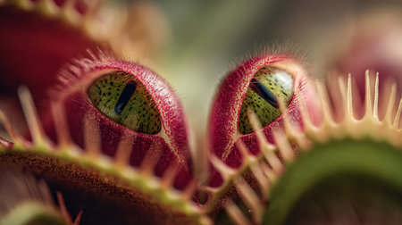 venus flytrap plants glisten with drops of water, as if sunrays are casting a dreamlike glow upon them. these fantasy creatures, captured in a photo on flickr, showcase a mesmerizing combination of light gold and red hues. the photo-realistic landscapes are brought to life with bold lines and vibrant colors, while the sparkling water reflections add an enchanting touch. ai generated