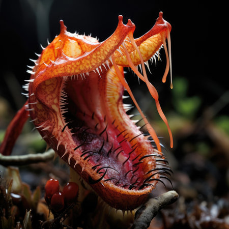 Close-up of colorful carnivorous plants, capturing the intricate details and vibrant colors in their tooth-like trap leaves. The background is dark to highlight the bright reds, pinks, greens, yellows, and oranges of these mesmerizing alien-like creatures. Captured with a Sony Alpha A7 III camera using a macro lens at f/2.8 aperture for sharp focus on each leaf. High resolution, high detail, cinematic lighting, hyper-realistic, super detailed, full HD. --ar 53:30 --v 6.1 Job ID: 244bb545-5ca5-4d3d-8b9f-64e63c0e7b21