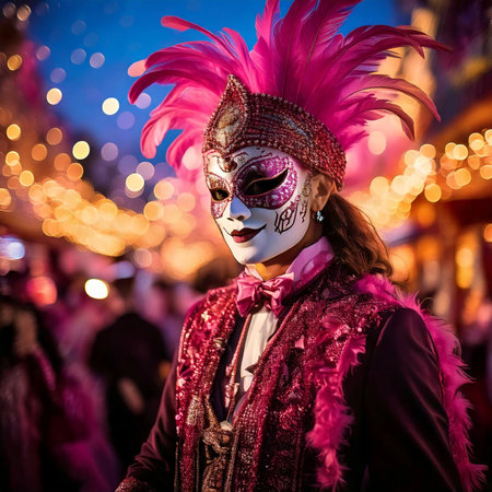 Mysterious Woman in Venetian Carnival Mask Amidst a Vibrant and Enchanting Celestial Parade at Night. Concept of Cultural Celebrations, Festive Atmosphere, Mysterious Beauty, and Italian Tradition.
