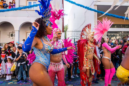 LOULE, PORTUGAL - FEBRUARY 2020: Colorful Carnival (Carnaval) Parade festival participants on Loule city, Portugal.