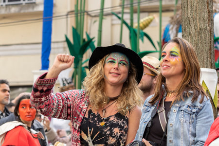 LOULE, PORTUGAL - 17th FEB 2024: Colorful Carnival (Carnaval) Parade festival audience participants on Loule city, Portugal.