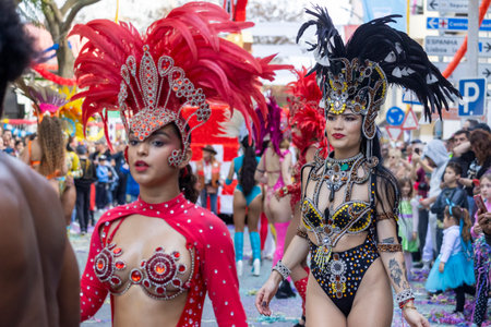 LOULE, PORTUGAL - 17th FEB 2024: Colorful Carnival (Carnival) Parade festival participants in Loule city, Portugal.
