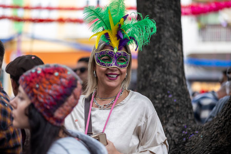 A woman wearing a mask and feather headdress during a carnival celebration. She is surrounded by a crowd of people, and the atmosphere is festive and joyful. The woman's costume is colorful and intricate, and her mask is a beautiful work of art.