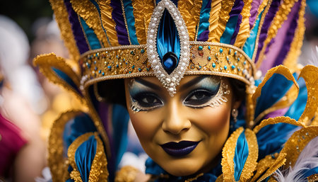 A woman in a yellow carnival costume smiles, her face painted with bright makeup and wearing a golden headpiece. The vibrant colors and feathers create a joyful and festive atmosphere
