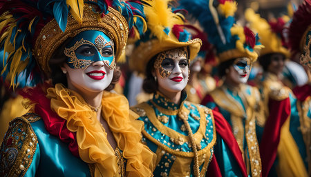 A group of people in Venetian carnival costumes and masks are walking in a parade, showcasing the vibrant and colorful culture of the event