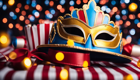 A close-up of a gold and blue masquerade mask with red ribbons and a festive background.