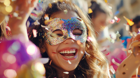 Happy girl enjoying Purim party wearing colorful carnival mask, surrounded by confetti. Concept of joyful celebrations, festive atmosphere, cultural traditions. Purim.