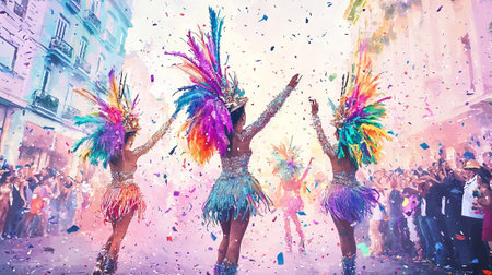 Colorful Brazilian Carnival Celebration with Three Women Dancing in Festive Feathered Costumes. Concept of Cultural Festivals, Joyful Parades, and Vibrant Street Celebrations.
