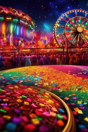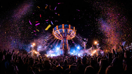 A vibrant carnival scene filled with confetti and excitement captures the joy of a nighttime festival. The atmosphere is alive with cheering crowds, thrilling rides, and colorful lights, showcasing a memorable event full of energy and enjoyment.