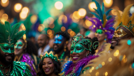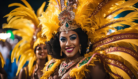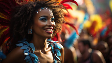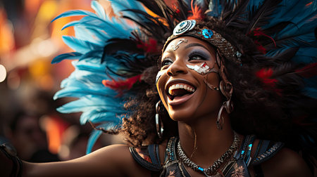 A radiant carnival queen with a feathered headdress and joyous expression amidst a festive backdrop
