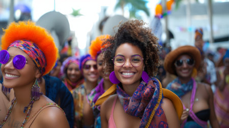 A group of vibrant, smiling women wearing colorful outfits and accessories enjoying a lively street parade scene filled with happiness and diversity.