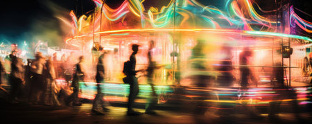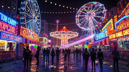 Vibrant and magical carnival atmosphere with blurred bokeh effect illuminating the night sky