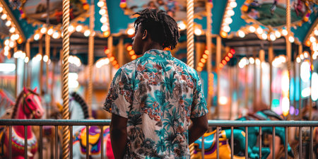 Rear view of African American man with dreadlocks in colorful shirt riding on merry-go-round