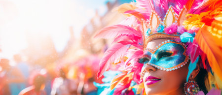 Mardi gras background with Brasil carnival bright dressed woman and copy space. AI Generated content
