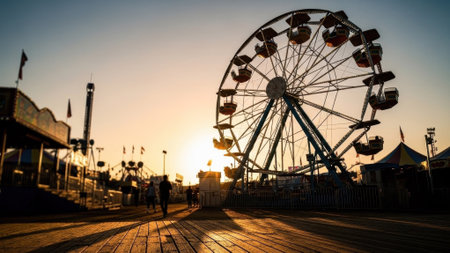 People stroll along a wooden boardwalk as the sun sets behind a Ferris wheel and other carnival attractions, casting long shadows
