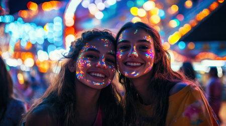 Two friends posing with broad smiles amidst a backdrop of carnival rides their faces painted with bright designs. The thrill of the festival is captured in their animated expression