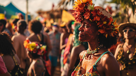 Participants dress in extravagant costumes adorned with feathers and beads, celebrating joyfully at an outdoor festival. The warm sunlight enhances the atmosphere, creating a magical experience filled with dancing and laughter.