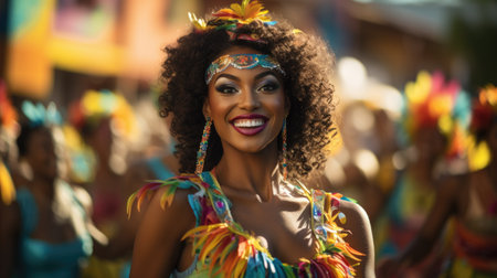 Generative AI Image of American Woman Samba Dancer with Headdress Smiling in City Street