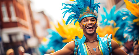 Latin performer in vibrant costume at festive street parade for Carnival. Concept Festival Celebrations, Street Parades, Latin Performers, Vibrant Costumes, Carnival Season