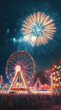 A vibrant carnival buzzes with excitement as glowing rides spin and fireworks light up the night sky, creating a lively backdrop for families and friends enjoying the festivities.