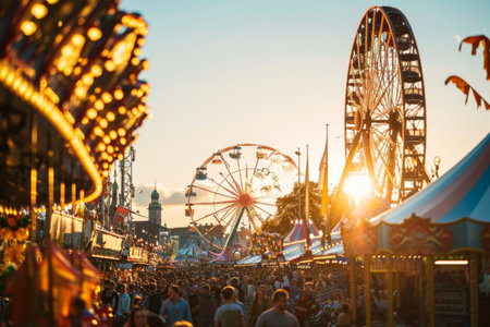 Amusement park at sunset in Paris, France. People on the background, people at the Oktoberfest in Munich, Beer tents and fairground rides on the Oktoberfest in Munich, AI Generated