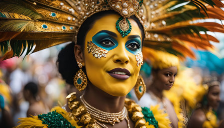A woman in a yellow carnival costume smiles, her face painted with bright makeup and wearing a golden headpiece. The vibrant colors and feathers create a joyful and festive atmosphere