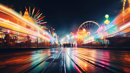 Exciting long exposure capture of vibrant amusement park rides in motion at night