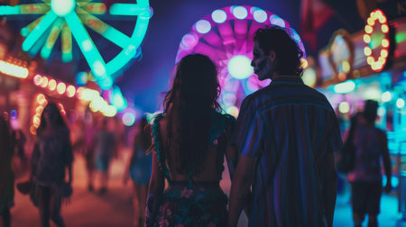 Couple walking at a halloween night carnival with neon lights. Concept of romance, amusement park experience, night date, neon glow.